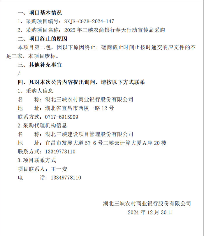 | 2025年三峽農(nóng)商銀行春天行動宣傳品采購(包二) 廢標(biāo)公告 |