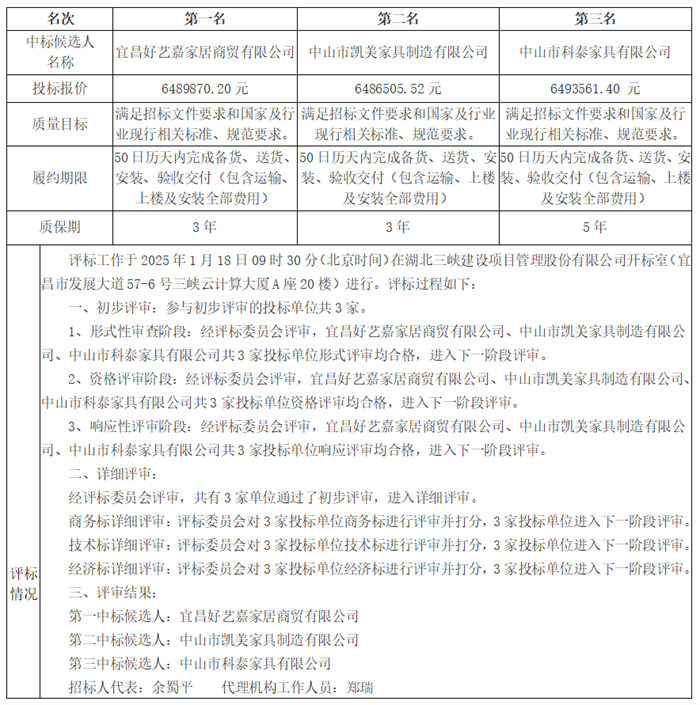 標(biāo)段(包)編號:SXJS-CGZB-2024-151 一、招標(biāo)概況 地建青年安居項目家具家電招標(biāo)項目于2025年1月18日09時30分在湖北三峽建設(shè)項目管理股份有限公司開標(biāo)室(宜昌市發(fā)展大道57-6號三峽云計算大廈A座20樓)開標(biāo)、評標(biāo),根據(jù)評標(biāo)委員會提交的評標(biāo)報告,現(xiàn)將中標(biāo)候選人公示如下: 二、評標(biāo)結(jié)果