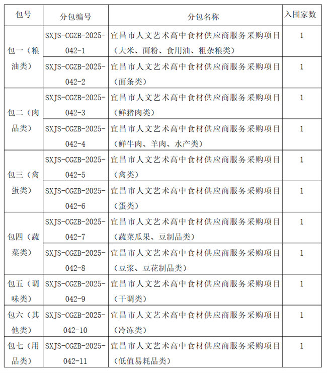 【項目概況】 宜昌市人文藝術(shù)高中食材配送供應(yīng)商服務(wù)采購項目的潛在供應(yīng)商應(yīng)在宜昌市發(fā)展大道57-6號三峽云計算大廈A座20樓獲取招標文件,并于2025年7月23日09點00分(北京時間)前遞交投標文件。 一、項目基本情況 1.項目編號:SXJS-CGZB-2025-042 2.項目名稱:宜昌市人文藝術(shù)高中食材配送供應(yīng)商服務(wù)采購項目 3.采購方式:公開招標 4.采購需求:宜昌市人文藝術(shù)高中食材配送供應(yīng)商服務(wù)采購項目共11個分包,具體分包如下,每個分包公開遴選一家供應(yīng)商(備選兩名排名第二、第三的供應(yīng)商)為宜昌市人文藝術(shù)高中提供為期三年的物資供應(yīng)。(詳見招標文件第三章采購需求)